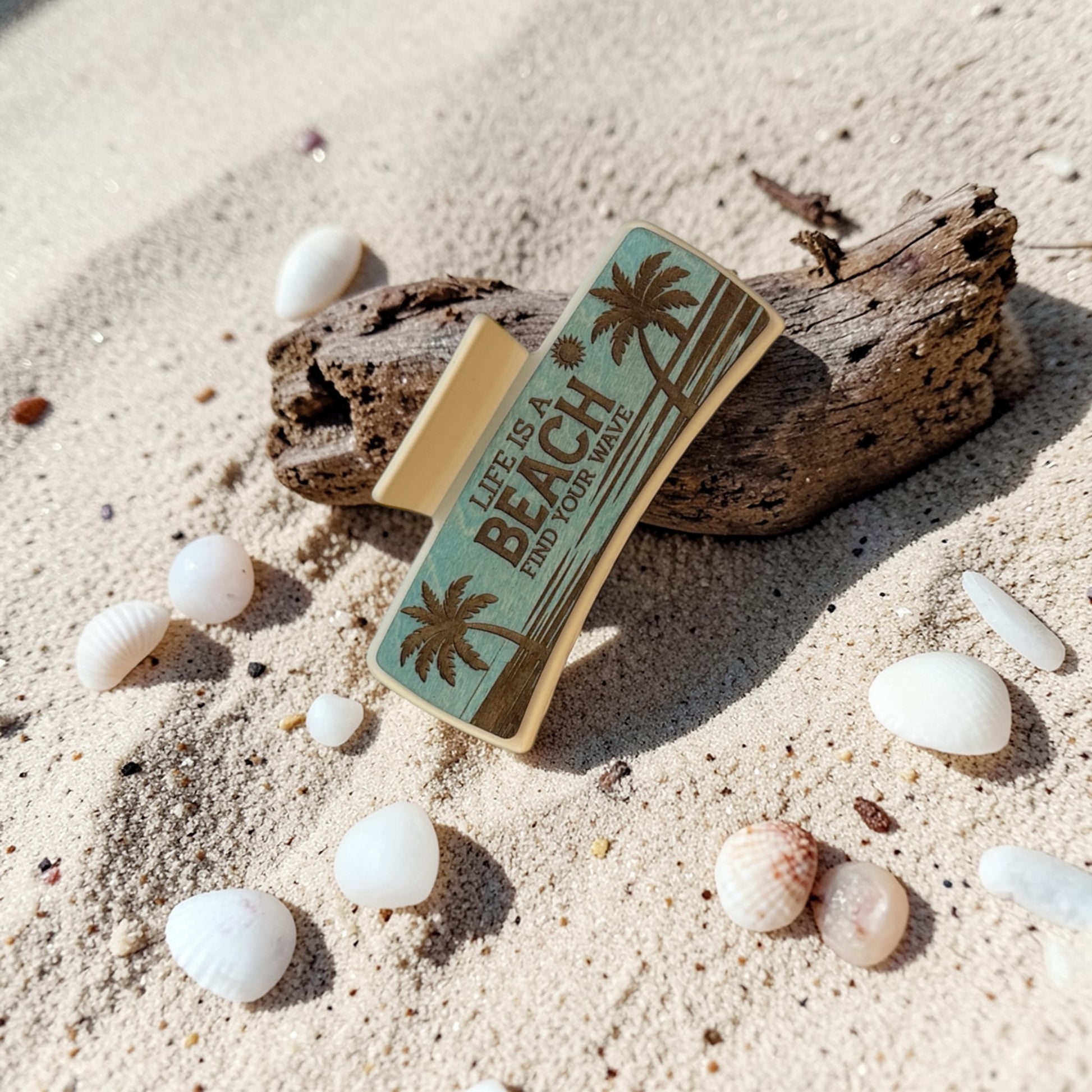 Channel those beachy vibes with ease! This unique hair claw clip features a cool laser engraved design with palm trees and the words "LIFE IS A BEACH FIND YOUR WAVE" The matte claw clip keeps your hair securely in place while adding a touch of boho-chic to your look. So whether you're feeling the ocean's call or just want to add a little tropical flair to your day, this claw clip has got you covered. Just find your wave and ride it, babe!